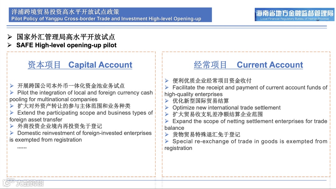 在洋浦跨境贸易投资高水平开放试点政策方面,管毅从资本项目和经常项目两个维度,结合实际应用场景进行了详细解读。