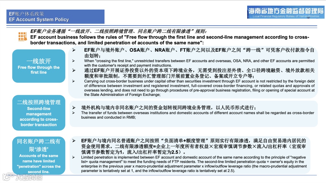 在EF账户方面,管毅对“一线放开、二线按照跨境管理、同名账户跨二线有限渗透”规则进行了详细解读。
