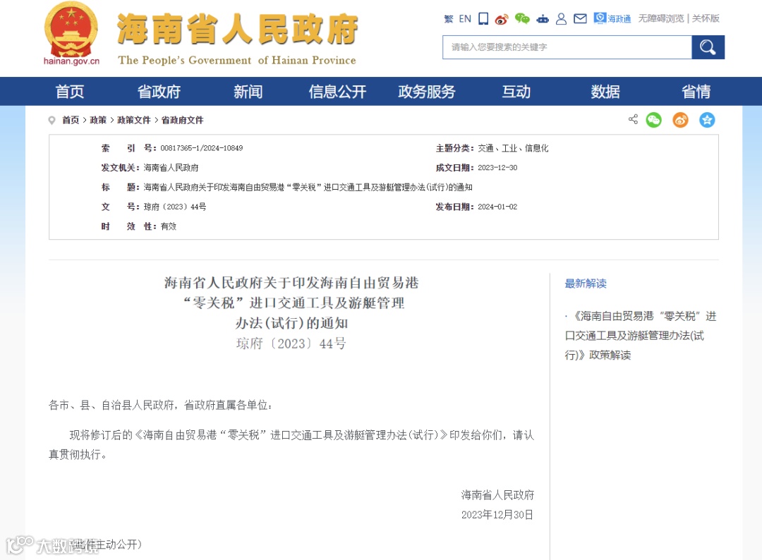 海南自贸港“零关税”进口交通工具政策更新,9大修订完善监管