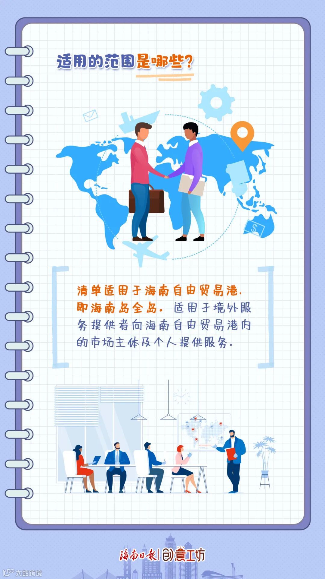 《海南跨境服贸负面清单》适用于海南自由贸易港,即海南岛全岛。适用于境外服务提供者向海南自由贸易港内的经营主体及个人提供服务。