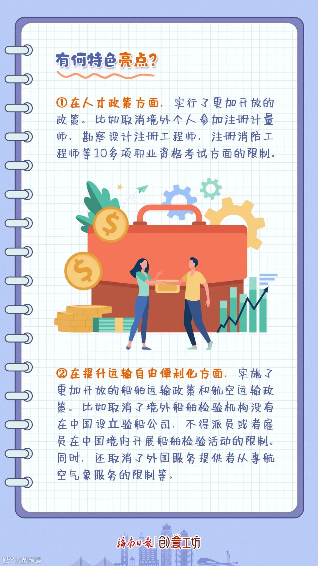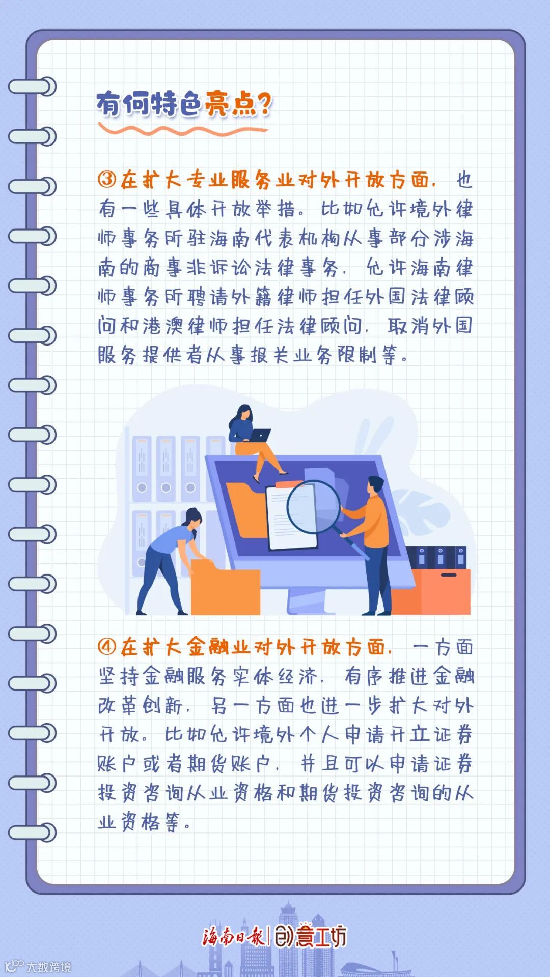 3.在扩大专业服务业对外开放方面,也有一些具体开放举措。比如允许境外律师事务所驻海南代表机构从事部分涉海南的商事非诉讼法律事务,允许海南律师事务所聘请外籍律师担任外国法律顾问和港澳律师担任法律顾问,取消外国服务提供者从事报关业务限制等。
