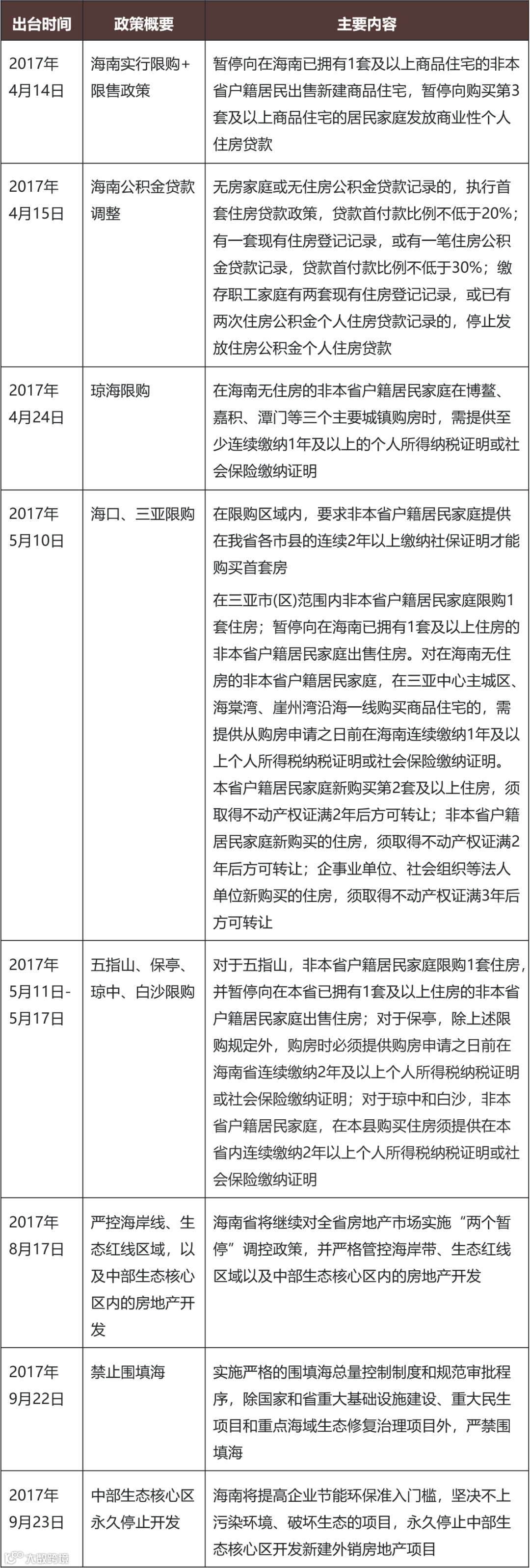 海南通过对中部核心生态区的调控保证当地居民的生活居住需求,堵住外来的购房需求和投机口子,并且向一线城市学习,采用五年社保政策;而在全域限购下,非海南省户籍居民家庭购房必须有2年以上的社保或个税。
