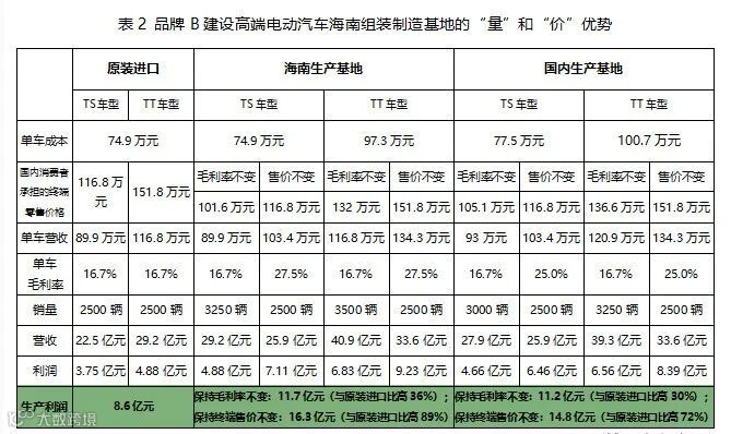 若品牌B海南生产基地年产2500辆TS车型、2500辆TT车型并全部售至中国大陆市场。与原装进口相比,如果保持原产地单车生产毛利率,生产利润可以提升36%;如果保持终端售价不变,生产利润可以提升89%,均高于国内组装制造基地生产利润提升幅度。
