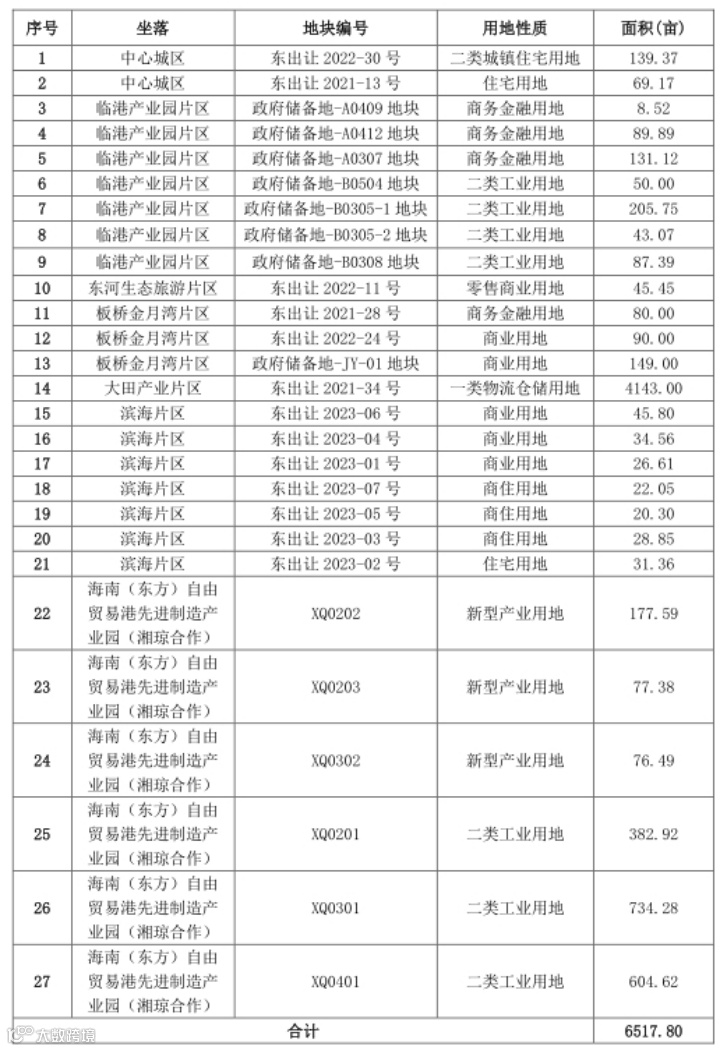 此外,东方市还推介优质地块共计21宗,总用地面积5541.26亩。其中,位于滨海片区7宗,总面积209.53亩,包括31.36亩二类城镇住宅用地、71.2亩商住混合用地、106.97亩商务商业混合用地;位于中心城区2宗,总面积208.54亩,包括139.37亩的二类住宅用地和69.17亩的住宅用地;位于临港工业园区的7宗,总面积为615.74亩;位于东河生态旅游片区1宗零售商业用地,面积45.45亩;位于板桥金月湾片区的3宗商务金融用地,面积319亩;位于大田产业片区1宗物流仓储用地,面积41.43亩。