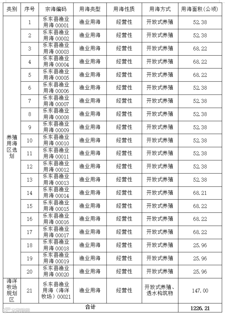 在海洋专场推介会上,重点推介海域共计21块,总用海面积1226公顷,位于莺歌海和龙栖湾海域,用海类型为开放式养殖用海和人工鱼礁用海。用海方式为开放式养殖用海、深水网箱养殖用海和透水构筑物用海。
