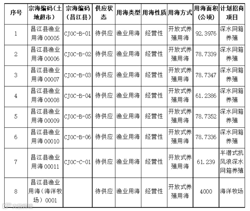 昌江县本次重点推介海域共计8块,是海域面积推介的重仓区,总用海面积4529.81公顷,位于海尾镇海域与棋子湾海域,用海类型为渔业用海,用海方式为开放式养殖用海。