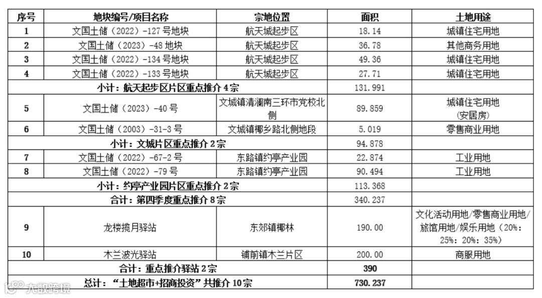 文昌市本次重点推介地块共计10宗,其中文昌中心城区2宗,文昌国际航天城园区4宗,约亭产业园区2宗,省级旅游驿站2宗。重点推介地块总用地面积730.24亩,其用地类型主要为城镇住宅用地、商服用地、工业用地等。