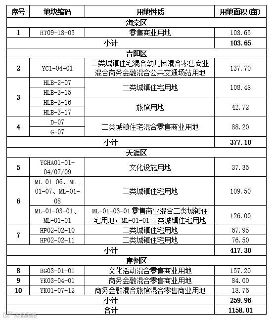 三亚市本次重点推介地块共计10宗,其中三亚中心城区6宗,海棠湾片区1宗,崖州湾片区3宗。总面积约1158亩,用地类型主要为住宅用地、商服用地及公共管理与公共服务用地。