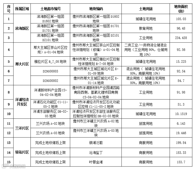 儋州市本次重点推介地块共计15宗,其中滨海新区3宗,那大片区4宗,洋浦经济开发区3宗,兰洋片区2宗,驿站片区3宗。重点推介地块总用地面积1436.8639亩,用地类型主要为住宅用地(含住宅混合用地)、商服用地、工矿仓储用地及教育用地。