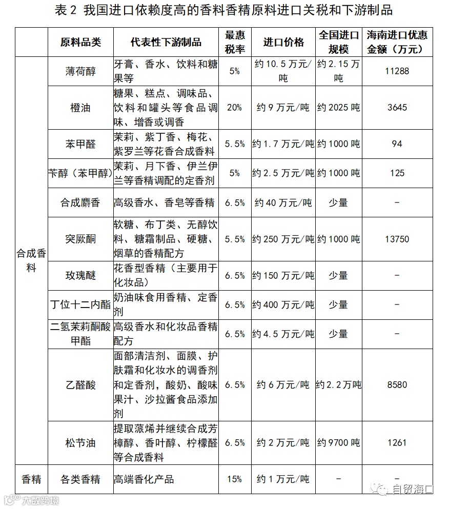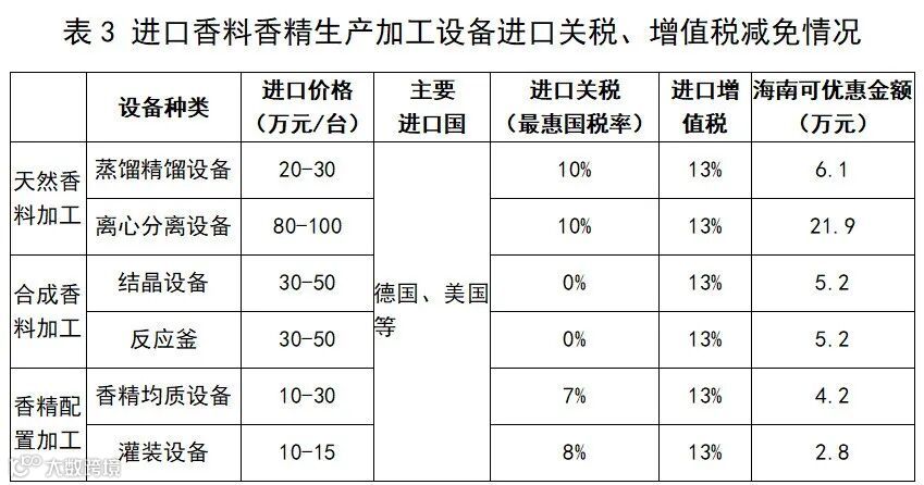 以香精完全依赖进口的香水加工企业为例。假设企业年产1000万瓶高端香水、每瓶香水重100克,香精含量约为20%,则企业每年需要进口香精200吨,按照进口香精价格1万元/吨(即0.1元/克)、进口关税15%计算,若企业在内地建设生产基地,每年的香精原料成本需要约2000万元,若企业在海南建设生产基地,每年可获得原料进口关税减免约300万元。