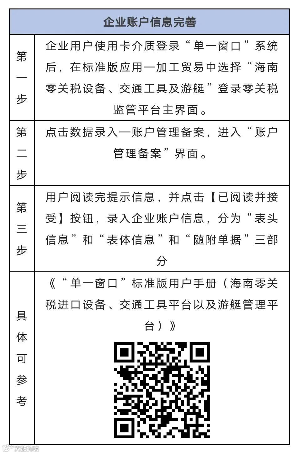岛内企业在首次进口零关税交通工具(征免性质492零关税交通工具及游艇、494 零关税交通工具游艇缴纳进口环节税)前登录“海南零关税进口设备、交通工具及游艇管理”平台建立账户信息。未建立企业账户信息的,首次申报进口设备、交通工具,“单一窗口”系统将予以退单。大体步骤如下表: