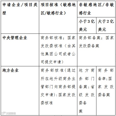 对属于备案情形的境外投资,中央企业报商务部备案;地方企业报所在地省级商务主管部门备案;3亿美元以上项目省级商务部门初审后报商务部备案。对属于核准情形的境外投资,中央企业向商务部提出申请,地方企业通过所在地省级商务主管部门向商务部提出申请。