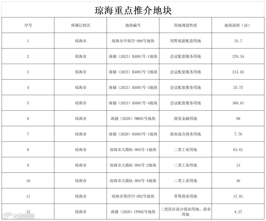 本次重点推介地块 12 宗,其中博鳌特别规划区 5 宗,博鳌海滨旅游区博鳌小镇 2 宗,大路农产品加工区3宗及其他地块 2 宗。总用地面积 1165.70 亩,用地类型主要为商服用地、工业用地。