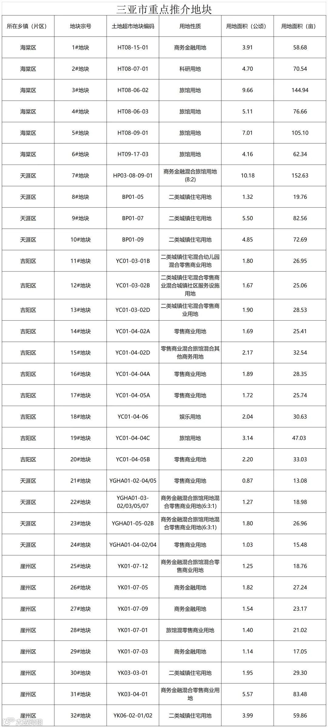 本次重点推介地块共计32宗,其中三亚中心城区18宗,海棠湾片区6宗,崖州湾片区8宗。总用地面积1503.56亩,用地类型主要为住宅用地、商服用地及公共管理与公共服务用地。