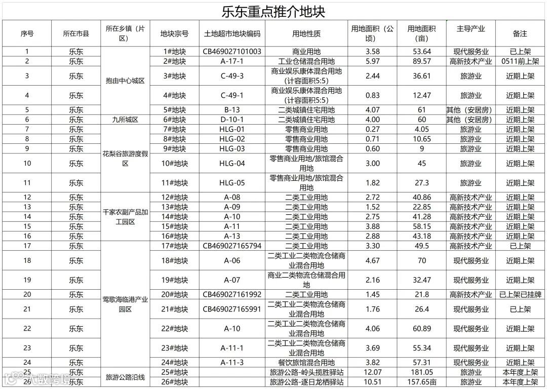 本次重点推介地块共计26个地块,总用地面积1170.37亩,用地类型主要为二类城镇住宅用地(安居房)、零售商业用地、零售商业混合旅馆用地、工业仓储混合用地以及商业娱乐康体混合用地,大力推出我县千家农副产品加工产业园区、莺歌海临港产业园区、2个旅游公路驿站项目等一系列重点项目地块。