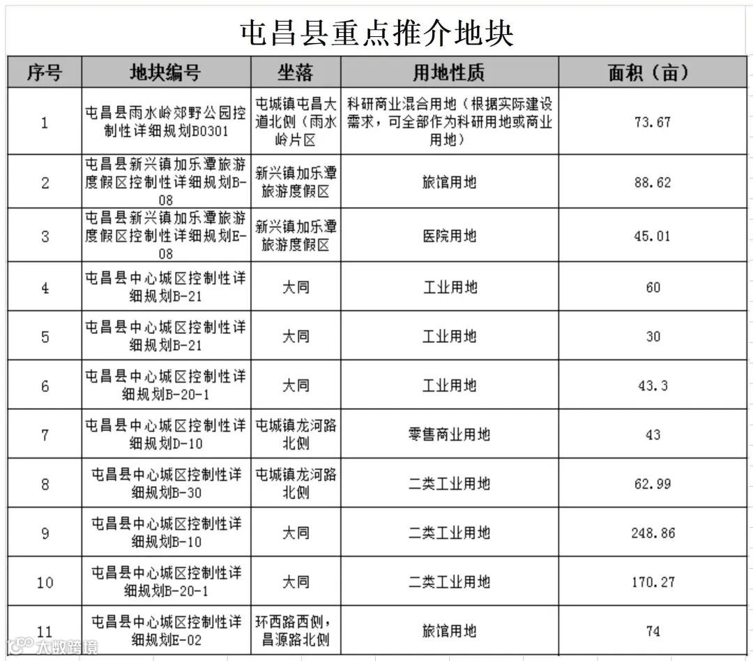 屯昌县本次重点推介地块共计11宗,其中中心城区9宗,新兴镇加乐潭2宗。总用地面积共939.72亩,用地类型主要为商服用地、公共管理与公共服务用地及工业用地。