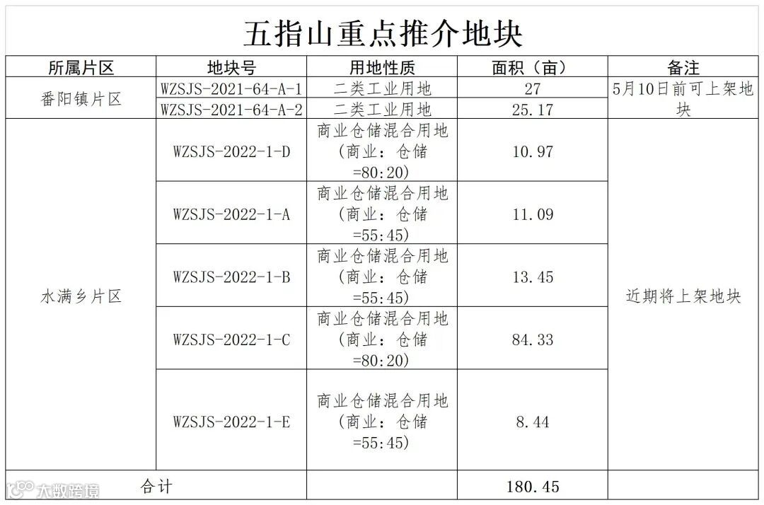 五指山市本次重点推介地块共计7宗,位于番阳镇、水满乡,总面积180.45亩,其中番阳镇2宗,用地类型为二类工业用地,面积52.17亩;水满乡5宗,用地类型为商业仓储混合用地,面积128.28亩。