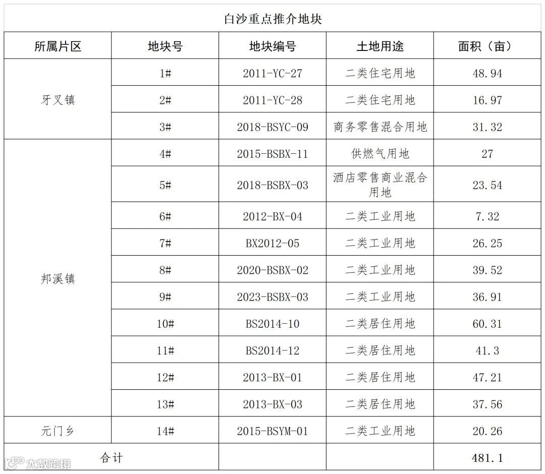 白沙县本次重点推介地块共计14宗,其中牙叉主城区3宗,邦溪镇10宗,元门乡1宗,总用地面积共481.1亩,用地类型主要为:商服用地、居住用地、工矿仓储用地及公设施用地。