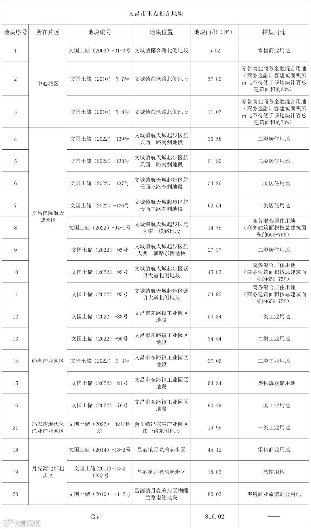 本次重点推介地块共计20宗,其中文昌中心城区3宗,文昌国际航天城园区8宗,约亭产业园区5宗,冯家湾现代化渔业产业园区1宗,月亮湾北部起步区3宗。重点推介地块总用地面积816.02亩,用地类型主要为住宅用地、商服用地、工业用地及物流仓储用地。