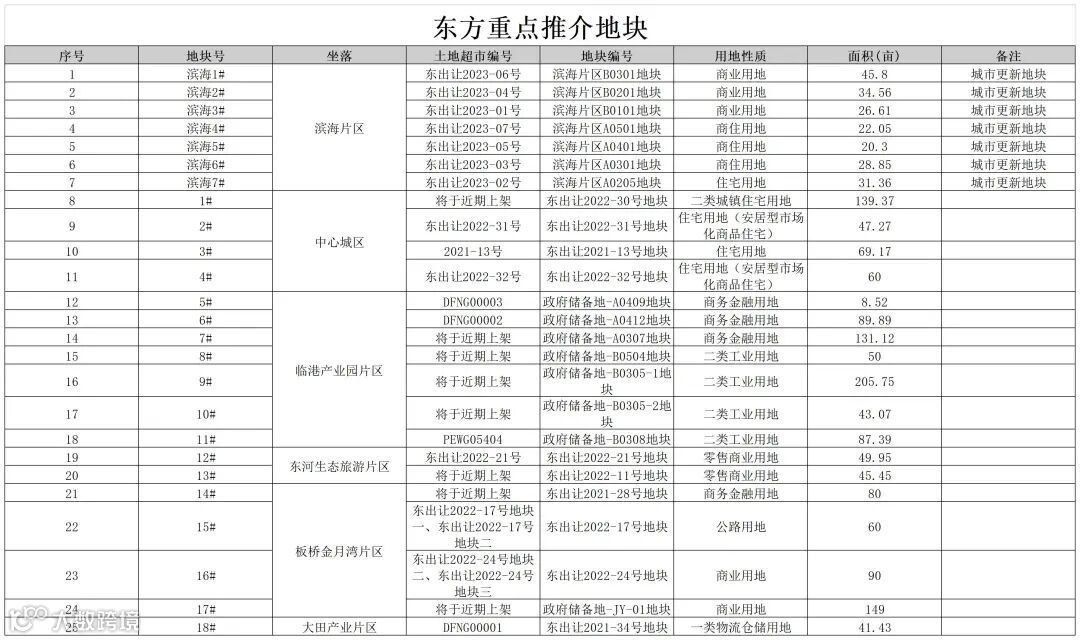本次重点推介地块共计25宗(含城市更新地块7宗),其中滨海片区7宗(均为城市更新地块),中心城区4宗,临港产业园片区7宗,东河生态旅游片区2宗,板桥金月湾片区4宗,大田产业片区1宗。推介地块总用地面积为1656.91亩,主要涉及商务板块、住宅板块、工业板块、交通运输板块(公路用地)和仓储板块。
