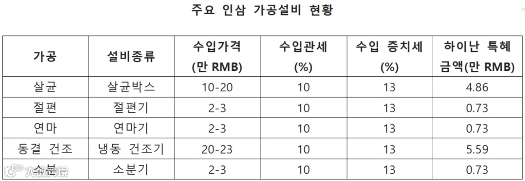 다음은 하이난 수입 인삼 가공설비 세수 특혜 현황이다.