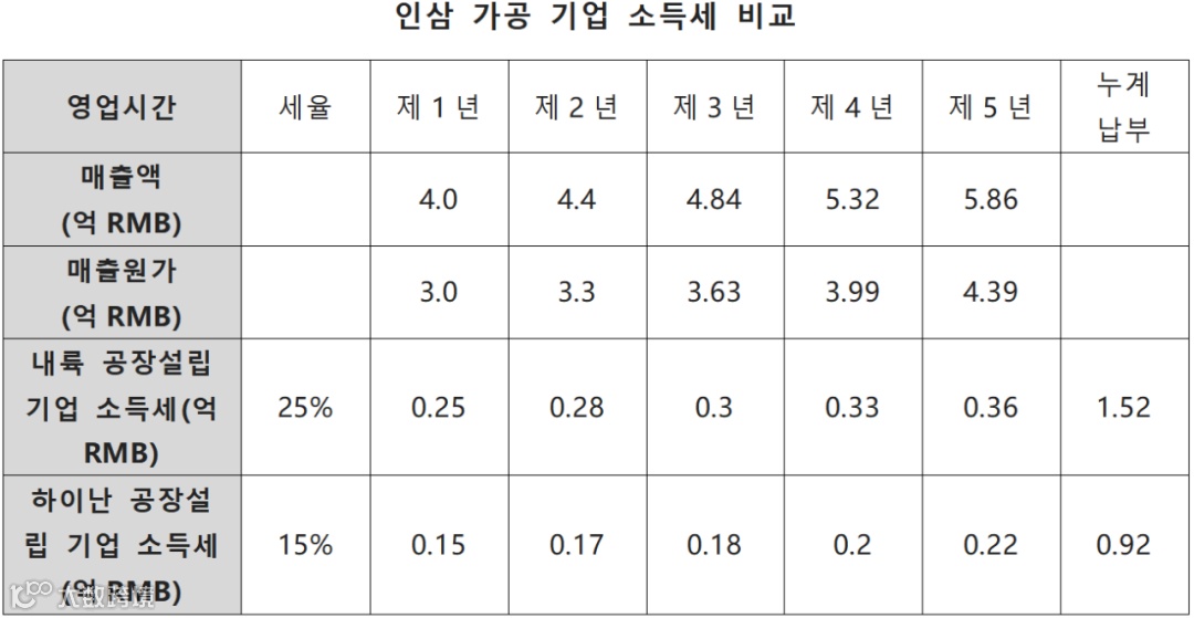 상기와 같이 현재 중국 인삼업계 선도기업의 생산가공 경영상황에 대한 종합 평가를 통해 하이난 자유무역항 기업소득세 정책이 부여한 기업소득세 특혜와 결합해 보면, 인삼 가공기업의 경영방전 5년을 기수로 할 경우, 하이난은 내륙 대비 5년간 누계 0.6억RMB를 절약할 수 있다.