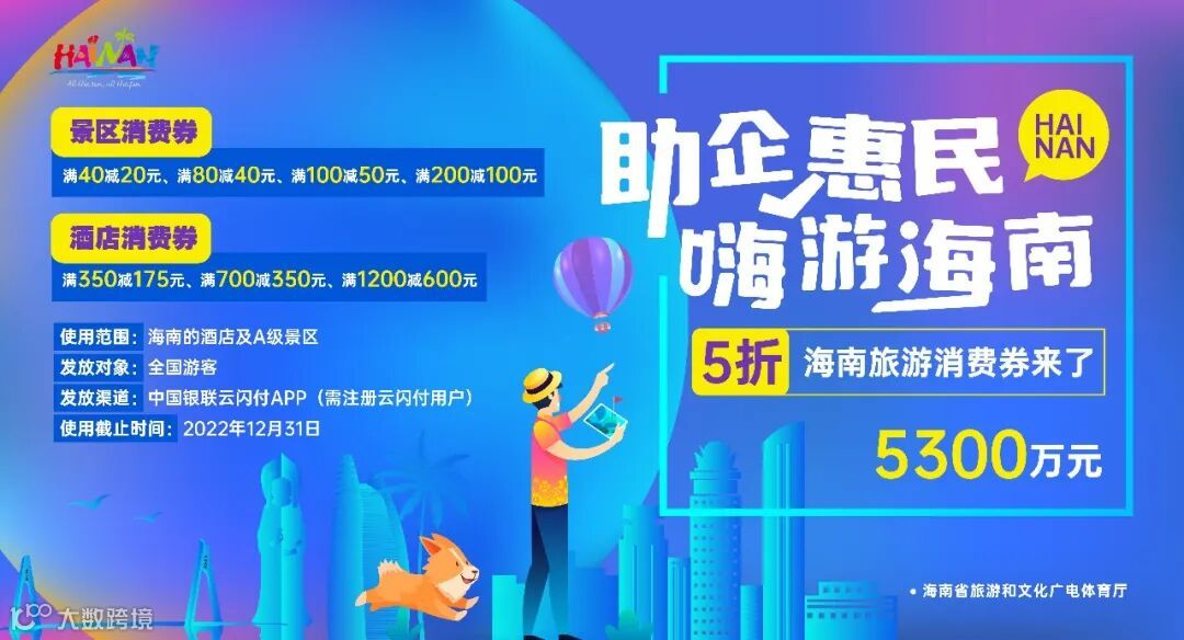 据了解,在《海南省稳经济助企纾困发展特别措施(2.0版)》中,海南省特别追加安排了面向游客的5000万元旅游消费券。同时,中国银联也将投入资金300万元联合开展活动,此次旅游消费券共计发放总金额为5300万元。
