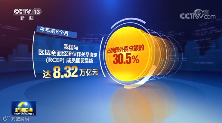 十年间,我国对外签署的自贸协定由10个增长到19个,增长了近1倍。今年1月1日,《区域全面经济伙伴关系协定》(RCEP)生效实施,全球最大的自贸区正式落地。今年前8个月,我国与RCEP成员国贸易额达8.32万亿元,占我国外贸总额的30.5%。