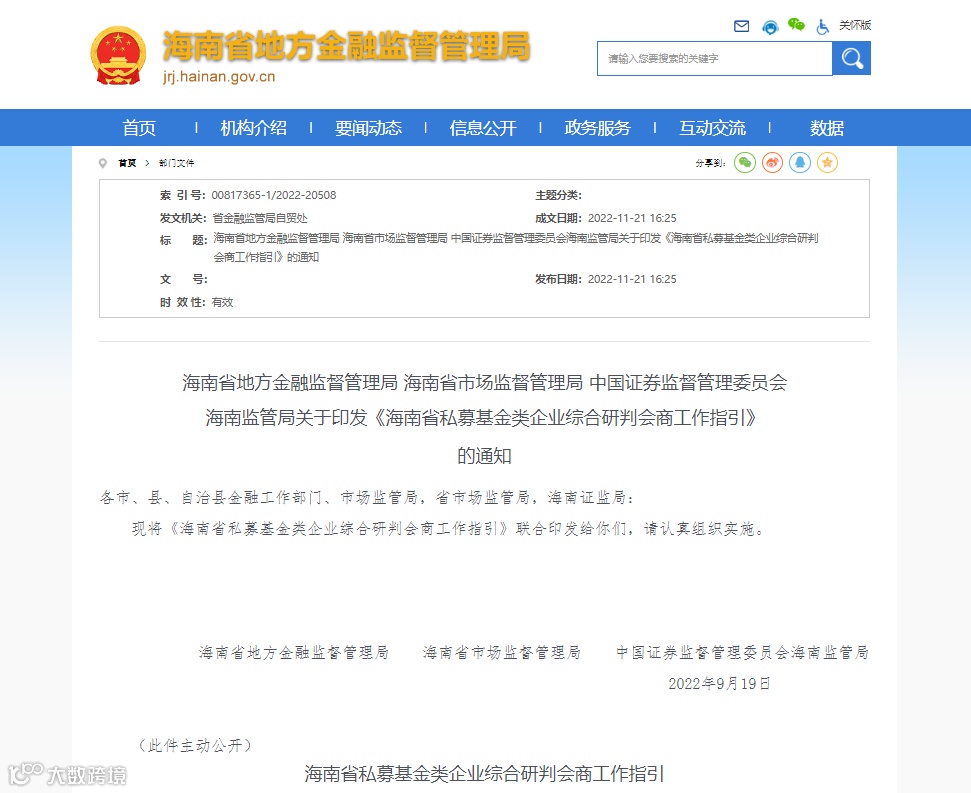 日前,海南省地方金融监督管理局、海南省市场监督管理局、中国证券监督管理委员会海南监管局联合印发《海南省私募基金类企业综合研判会商工作指引》,明确了我省私募基金类企业到市场监管部门登记注册的工作流程、绿色通道、监督管理、说明事项。具体如下:
