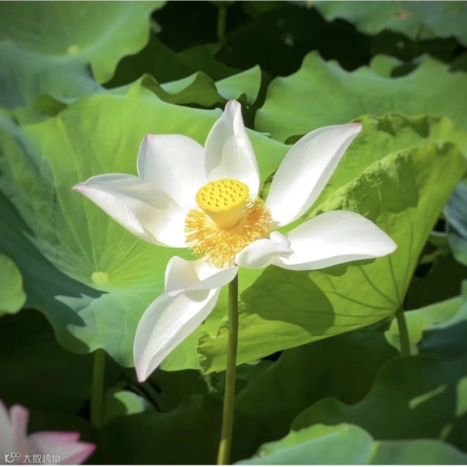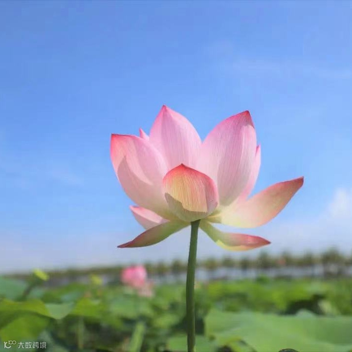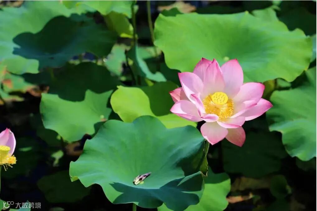 这里大片荷花与蓝天相接,在阳光的照耀下越发娇艳动人,有这样的大片荷塘做背景,何愁拍不出大片呢。