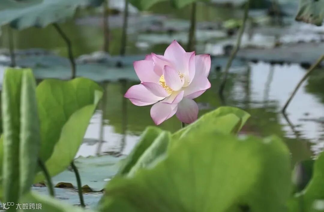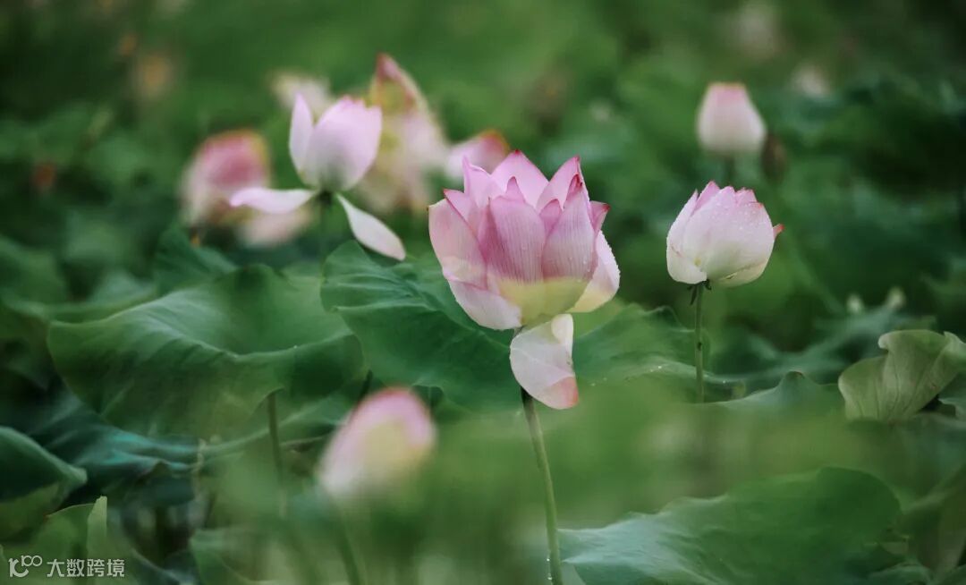 连片的荷花分布在农田里,微风吹来,荷花像个略施粉黛的姑娘,轻轻摇曳着裙摆,姿态优美的花朵在风中顾盼生姿,可谓是美不胜收。
