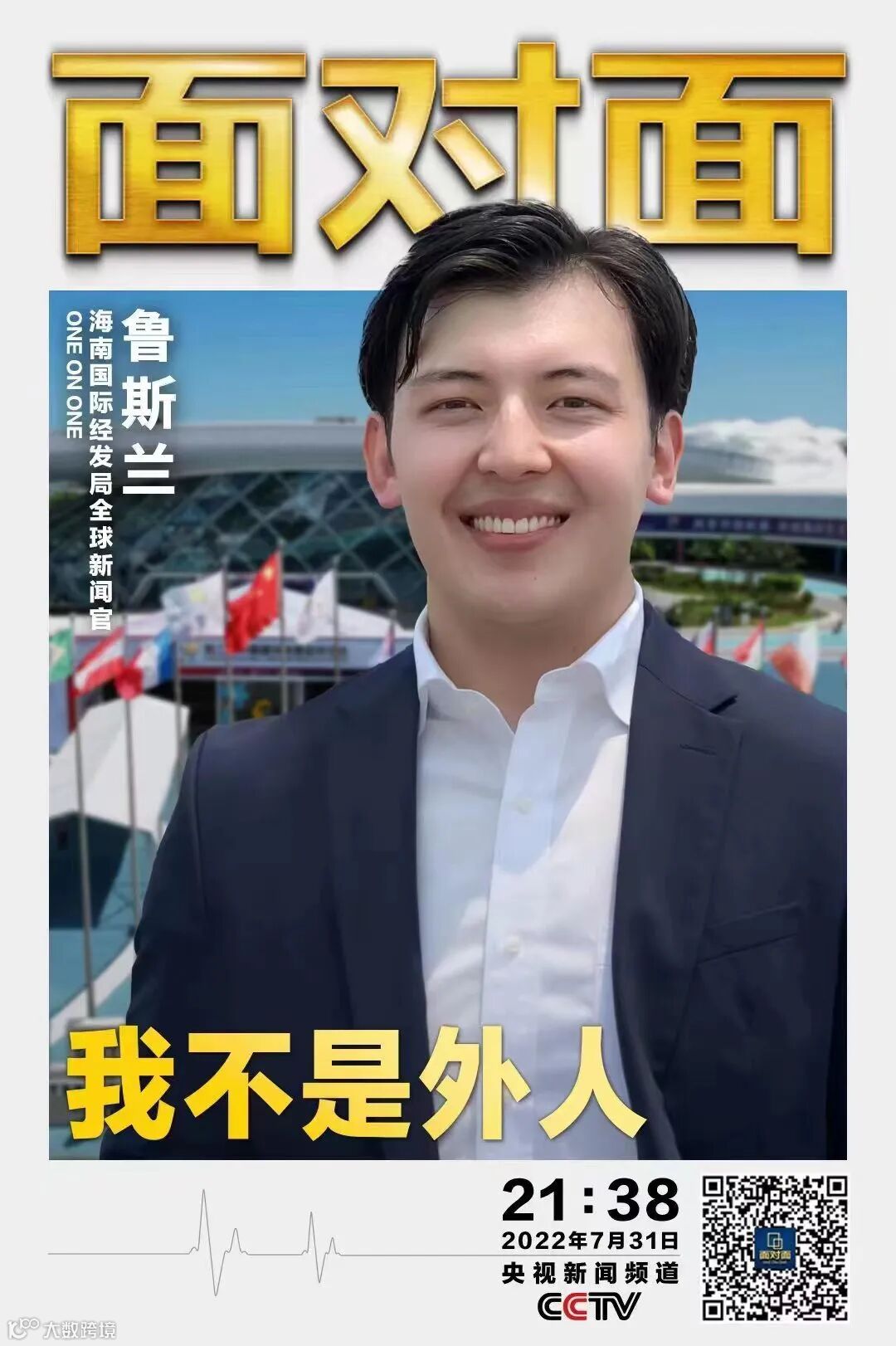 来自哈萨克斯坦的鲁斯兰因为不经意的献血行动备受关注,参与了海南自贸港建设。央视新闻频道《面对面》栏目专访海南国际经济发展局全球新闻官鲁斯兰,播出《鲁斯兰:我不是外人》,这也是鲁斯兰第二次接受央视新闻频道《面对面》栏目的专访。(首次为2017年6月10日,鲁斯兰在北京科技大学就读期间)