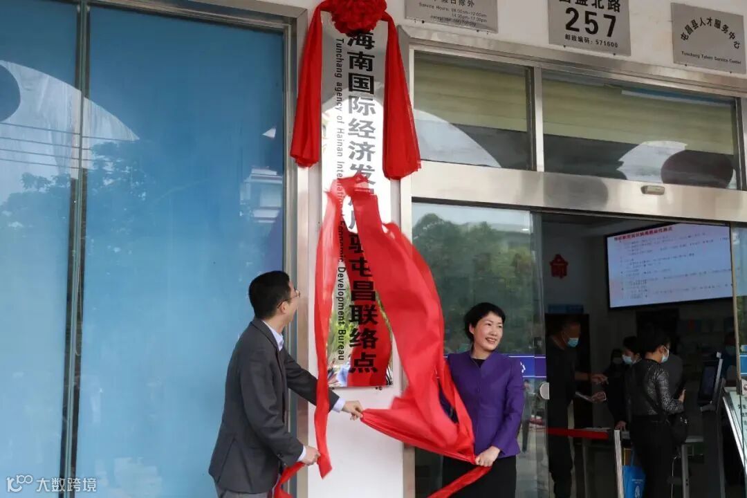 (图为海南国际经济发展局局长韩圣健与屯昌县委书记凌云共同为海南国际经济发展局驻屯昌联络点揭牌)