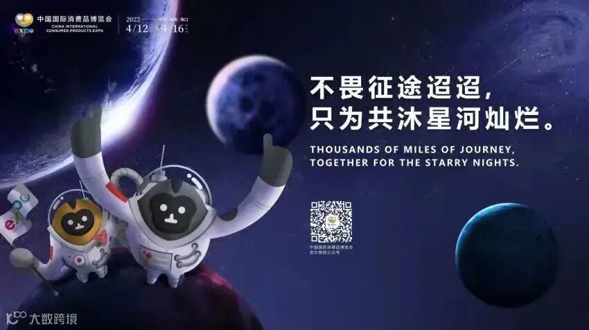 “宇航猿”则代表着航天科技产业。他们身穿右肩张贴了中国国旗的宇航服,一起探索无垠的太空。“元元”和“宵宵”以“不畏征途迢迢,只为共沐星河灿烂”的口号,以“有朋自远方来,不亦乐乎”的热情迎接全球消费精品齐聚消博会,一同携手创造美好的未来。