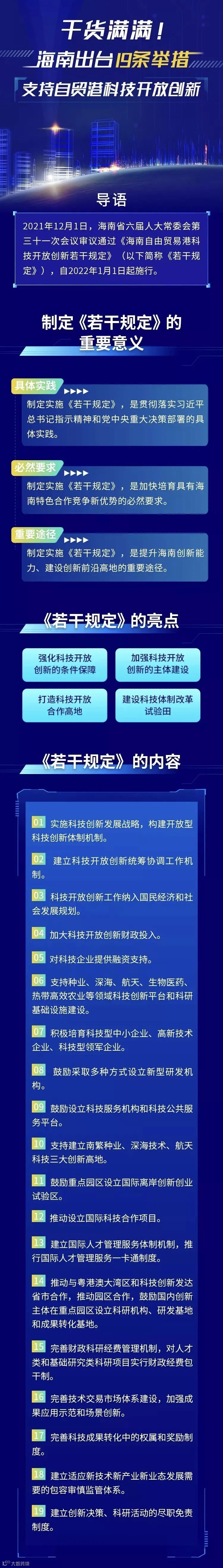 2月9日,海南召开《海南自由贸易港科技开放创新若干规定》(以下简称《若干规定》)政策解读新闻发布会。《若干规定》将从强化科技开放创新的条件保障、加强科技开放创新的主体建设、突出打造“陆海空”科技创新高地、打造科技开放合作高地以及建设科技体制改革试验田等5个方面提出19条措施支持海南自贸港科技开放创新。