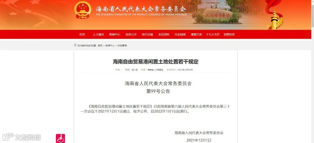 《海南自由贸易港闲置土地处置若干规定》已由海南省第六届人民代表大会常务委员会第三十一次会议于2021年12月1日通过,现予公布,自2022年1月1日起施行。