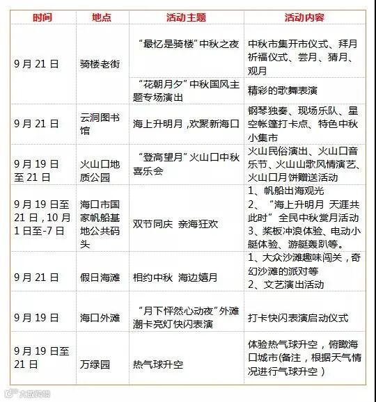 山与海的相遇,注定是一场自然的传奇。登上火山口,共赏团圆月。火山口公园是琼北地区的制高点,中秋到火山口来赏月观看海口城市夜景,度过快乐而充实的中秋节。具有文化底蕴,民间艺术独特魅力的火山八音、火山山歌风情演艺、以“火山中秋、乡村音乐”为主题,邀请歌手和乐队举办火山口夜间小型音乐节,打造多场民俗与时尚的音乐视听盛宴。在中秋假期三天,火山口每天送出400个传统月饼,来到火山口的游客、市民可以品尝到正宗的琼式老月饼。