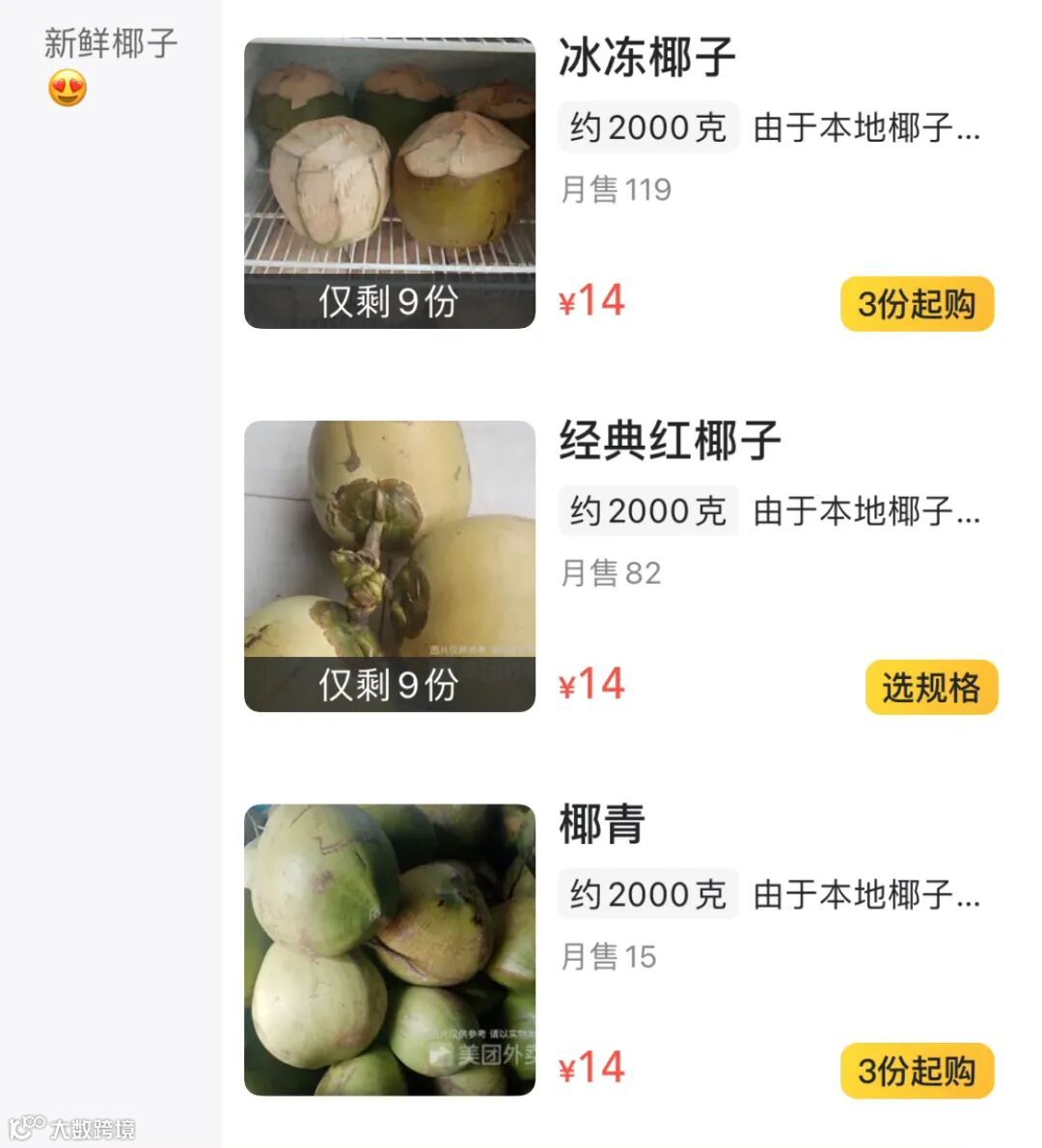 |冰冻椰子3份起购,如果找不到人拼单想喝个冰椰子还得自己买3个😭