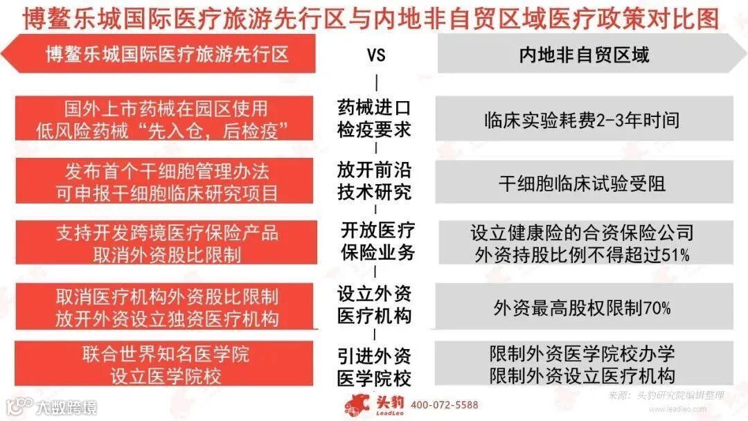 基于国家赋予特殊政策,博鳌乐城国际医疗旅游先行区在特许药械、医学研发、医疗保险、特许经营、医学交流等方面较内地非自贸区域有明显优势。