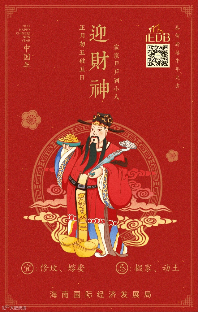 除此之外还需要祭财神、路头神以及送穷,旧俗春节期间大小店铺从大年初一起关门,而在正月初五开市。俗以正月初五为财神圣日,认为选择这一天开市必将招财进宝。