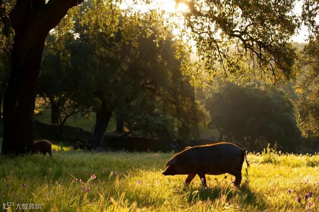 5J选用100%纯种伊比利亚黑猪, 自由生长在伊比利亚半岛西南的德艾萨草场, 以各类橡树果实及香料草丛为食。