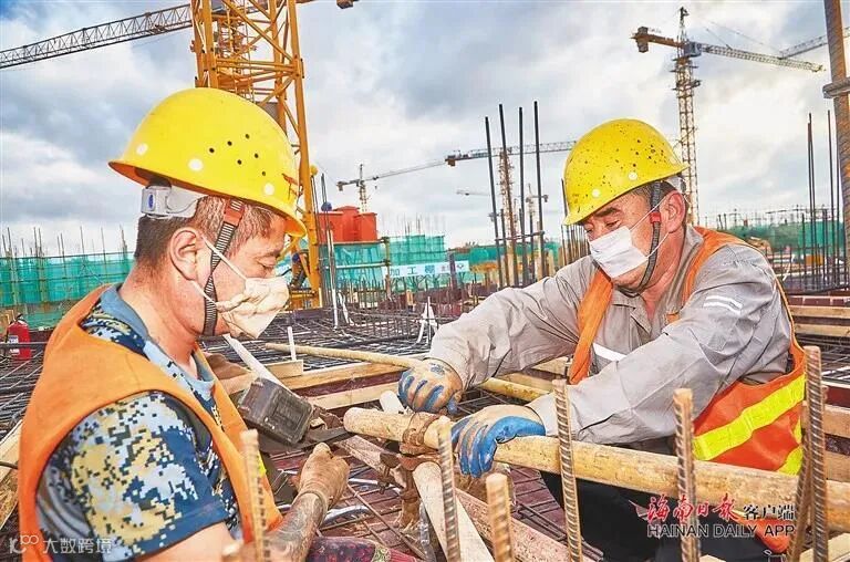 2月14日,第六届三亚亚洲沙滩运动会亚沙村A区建筑工地内,工人在进行模板安装加固工作。 亚沙村A区于2019年11月24日开工。今年2月,为保障项目加快建设,在做好疫情防护的工作准备后,687名工人实行24小时分班制度,不间断工作。海南日报记者 封烁 摄