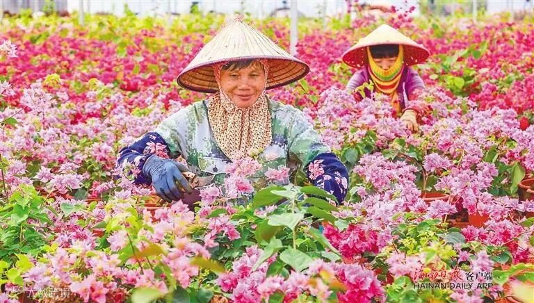 11月13日,在临高县花卉产业观光园内,一簇簇三角梅生长旺盛,脱贫户们在修剪花枝,打理园区。据悉,临高为积极调整产业结构,通过建设800亩花卉产业观光园,发展“美丽经济”,促进农民脱贫增收,助力乡村振兴。海南日报记者 陈元才 特约记者 刘彬宇 图/文