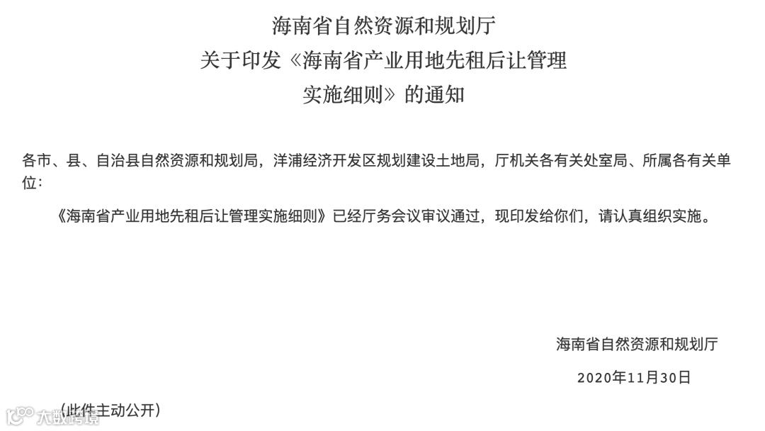 11月30日,海南省自然资源和规划厅印发《海南省产业用地先租后让管理实施细则》,明确先租后让的适用范围、供地年限、供地价格、供地程序、考核评价等要求。