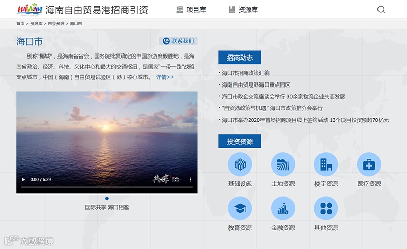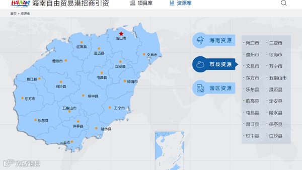 资源库主要聚集海南资源、市县资源、园区资源等内容,包括基本情况、视频宣传、招商动态、产业定位、招商重点、配套设施和基础设施、土地资源、楼宇资源、医疗资源、教育资源、金融资源等内容,覆盖海南省各市县和11个重点园区。比如,投资者如果想到海口投资,在资源库中打开对应页面后,即可了解海口的产业定位、招商重点、配套设施、招商动态等信息。