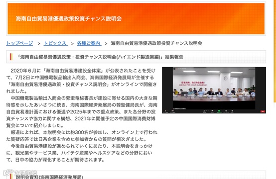 2020年6月に「海南自由貿易港建設全体案」が公表されたことを受けて、7月2日に中国機電製品輸出入商会、海南国際経済発展局が主催する「海南自由貿易港優遇政策・投資チャンス説明会」がオンラインで開催されました。
