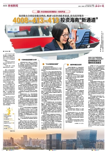 韩圣健介绍,为落实省委、省政府关于健全招商引资工作机制和营造国际一流的营商环境的要求,畅通全球投资者与海南的联系渠道,为全球投资者提供更优质、更贴身、更便捷的服务,海南国际经济发展局推出全球投资服务热线4008-413-413。热线从3月9日起试运行,并于4月13日正式运行。
