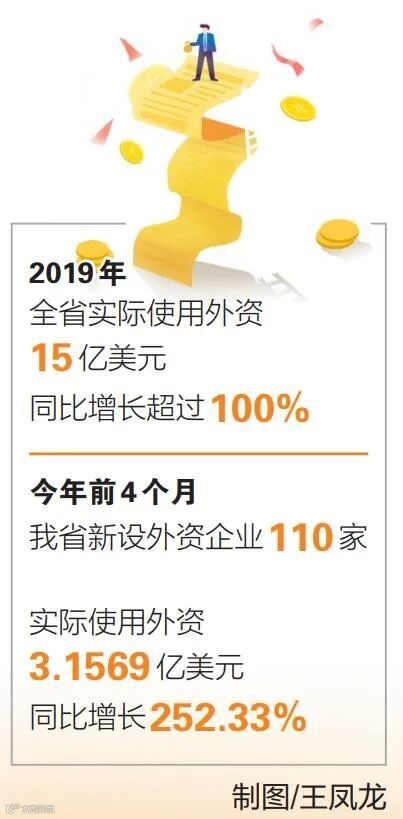 自去年4月在海口揭牌成立以来,海南国际经济发展局围绕“服务的增量、项目的增量、渠道的增量”,开展精准招商,提供专业服务,组织实施了博鳌亚洲论坛“美丽乡村会客厅”一对一招商活动等一系列专业招商推介活动,与壳牌、保时捷、丰田、微软、西门子、哈斯基、POSH、Dufry、福特斯克、沙特基础等数十家全球知名和行业领军企业建立了联系机制,推出“投资海南”微信公众号,设立4008-413-413全球投资服务热线,助推海南实际使用外资实现翻番。2019年,全省实际使用外资15亿美元,同比增长超过100%。今年前4个月,我省新设外资企业110家;实际使用外资3.1569亿美元,同比增长252.33%。