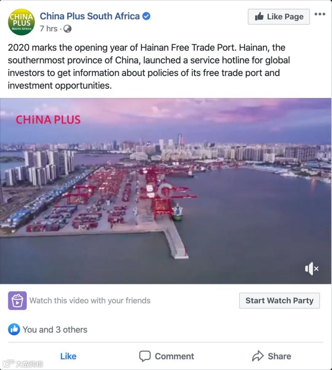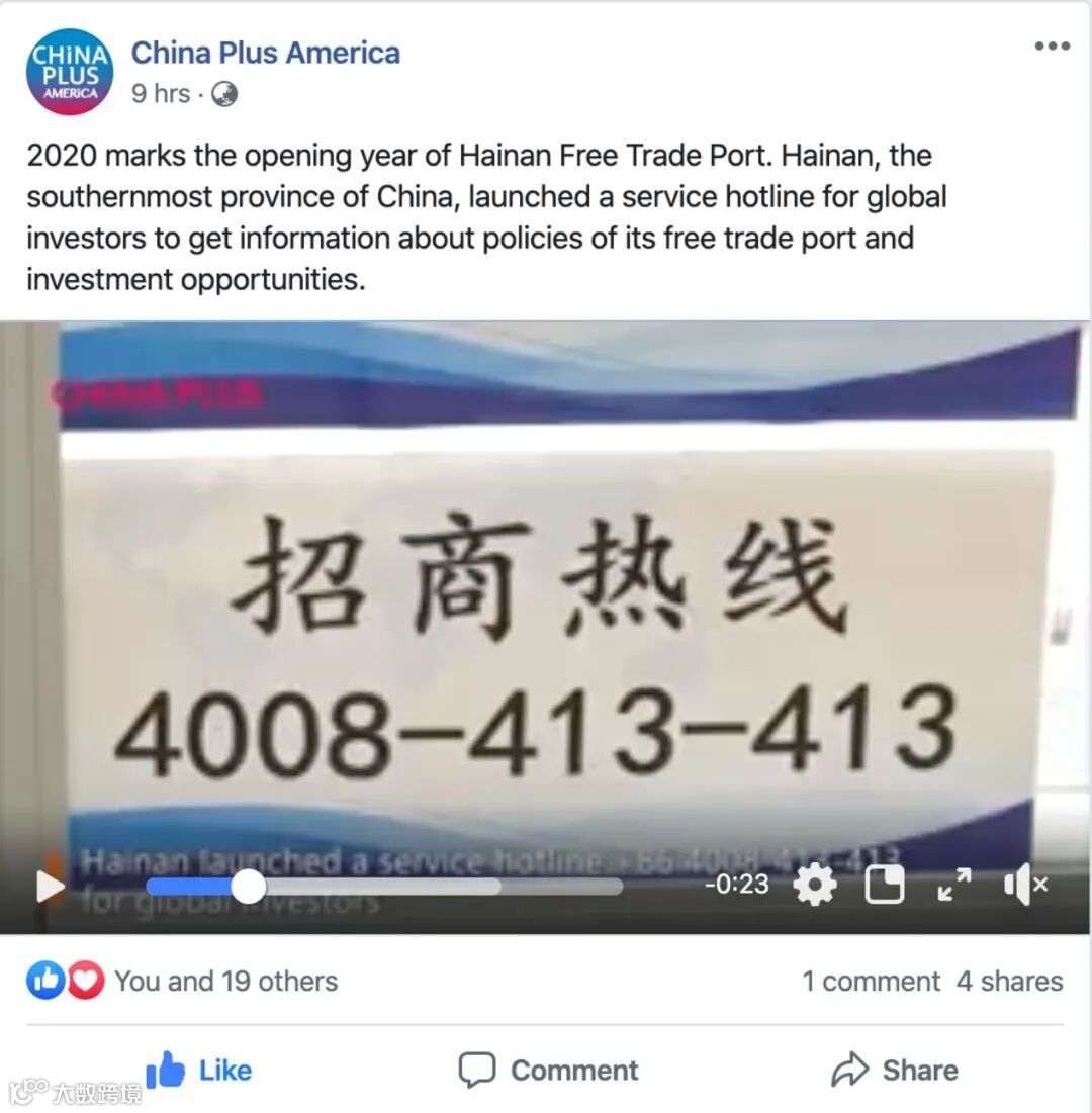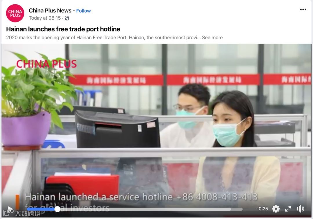 据悉,CGTN在其Facebook平台上对海南全球投资服务热线进行了报道。在其官方Facebook 账号China Plus的推文中,CGTN引用我台国际传播融媒体中心制作的视频素材并指出,2020是海南自由贸易港的开局之年,这个中国最南端的省份推出了全球投资者服务热线,将为全球投资者在自贸港政策及投资机会等问题上提供帮助。