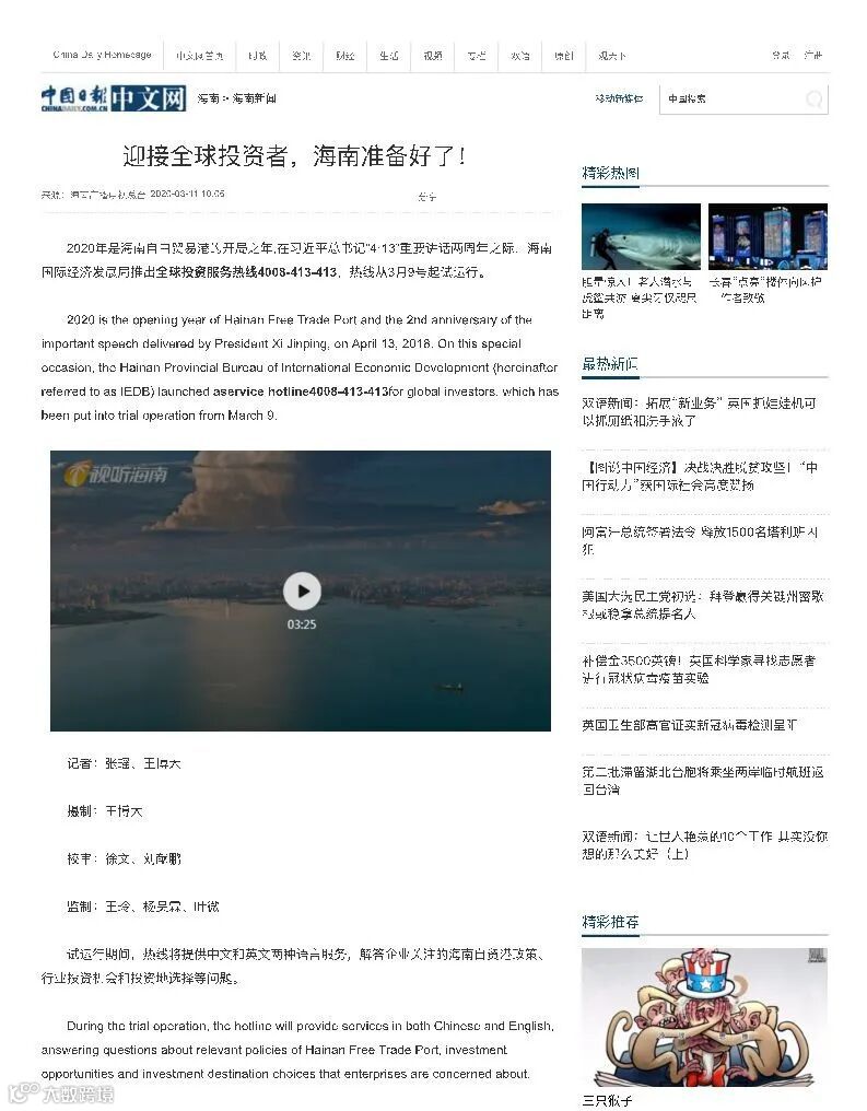 3月9日,海南推出全球投资服务热线4008-413-413,引起了国内舆论的广泛关注。这是在自由贸易港建设的开局之年,以及在习近平总书记“4·13”重要讲话两周年之际,海南推出的一项重要措施。此举也得到了中国国际电视台(CGTN)及中国日报(China Daily)的关注。